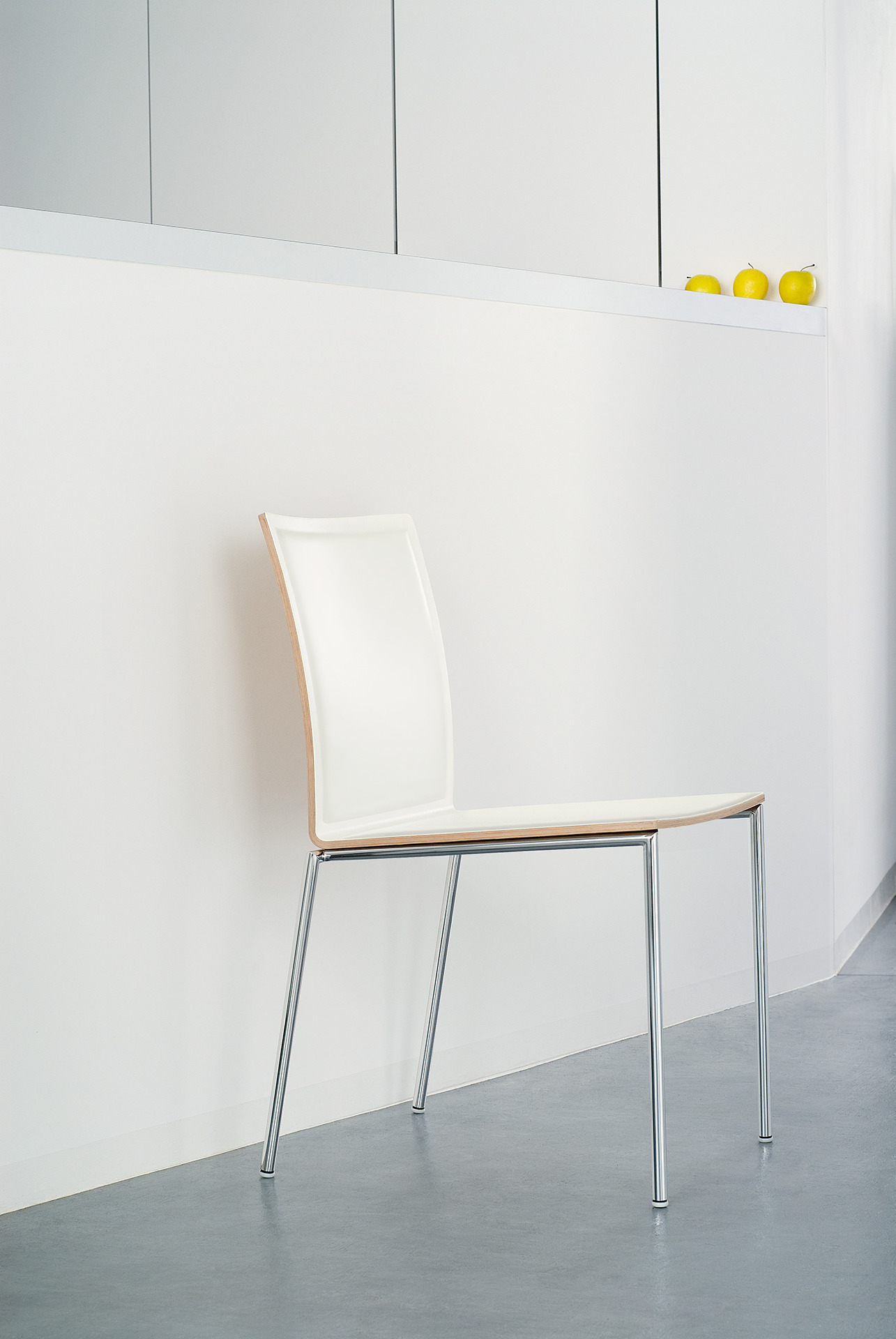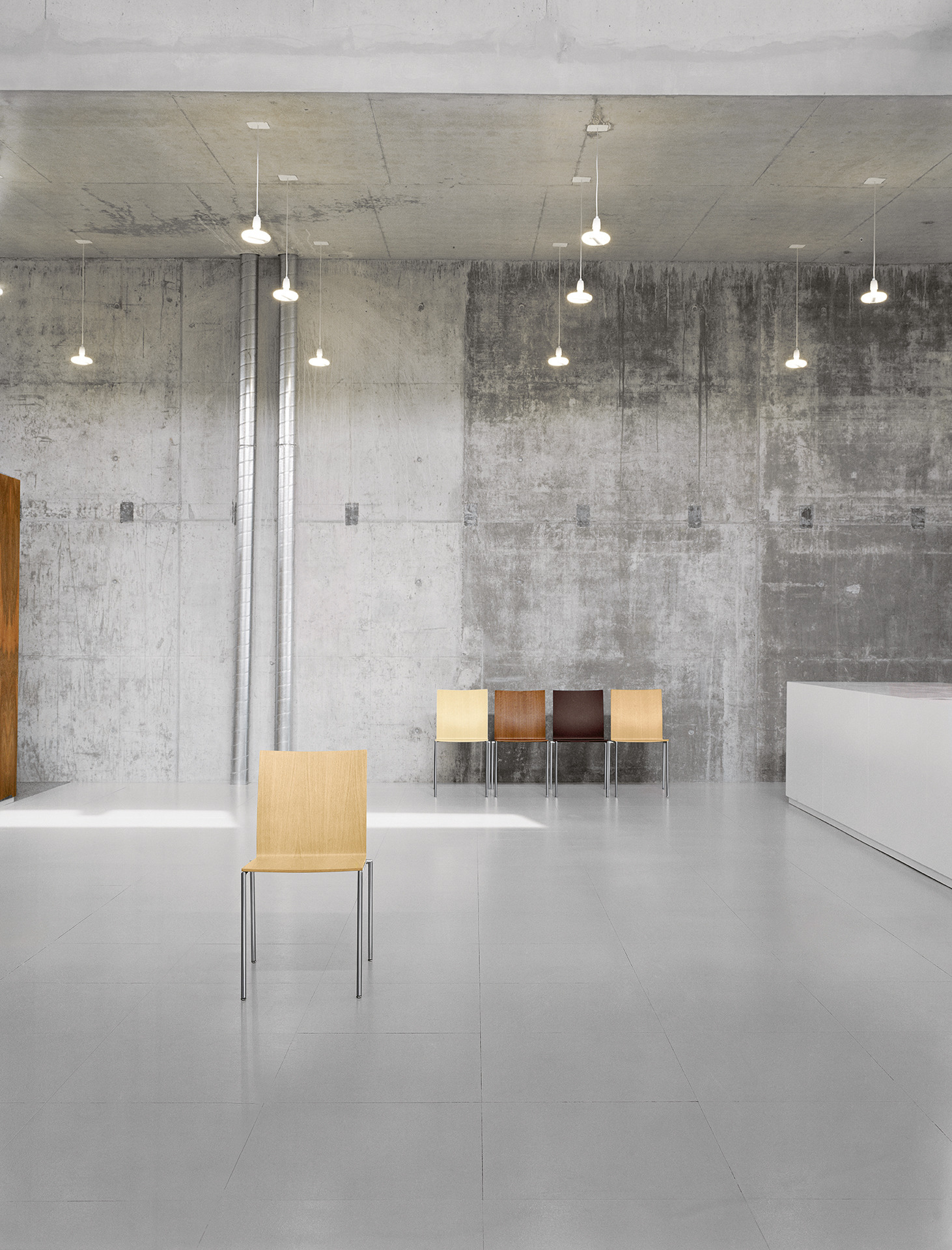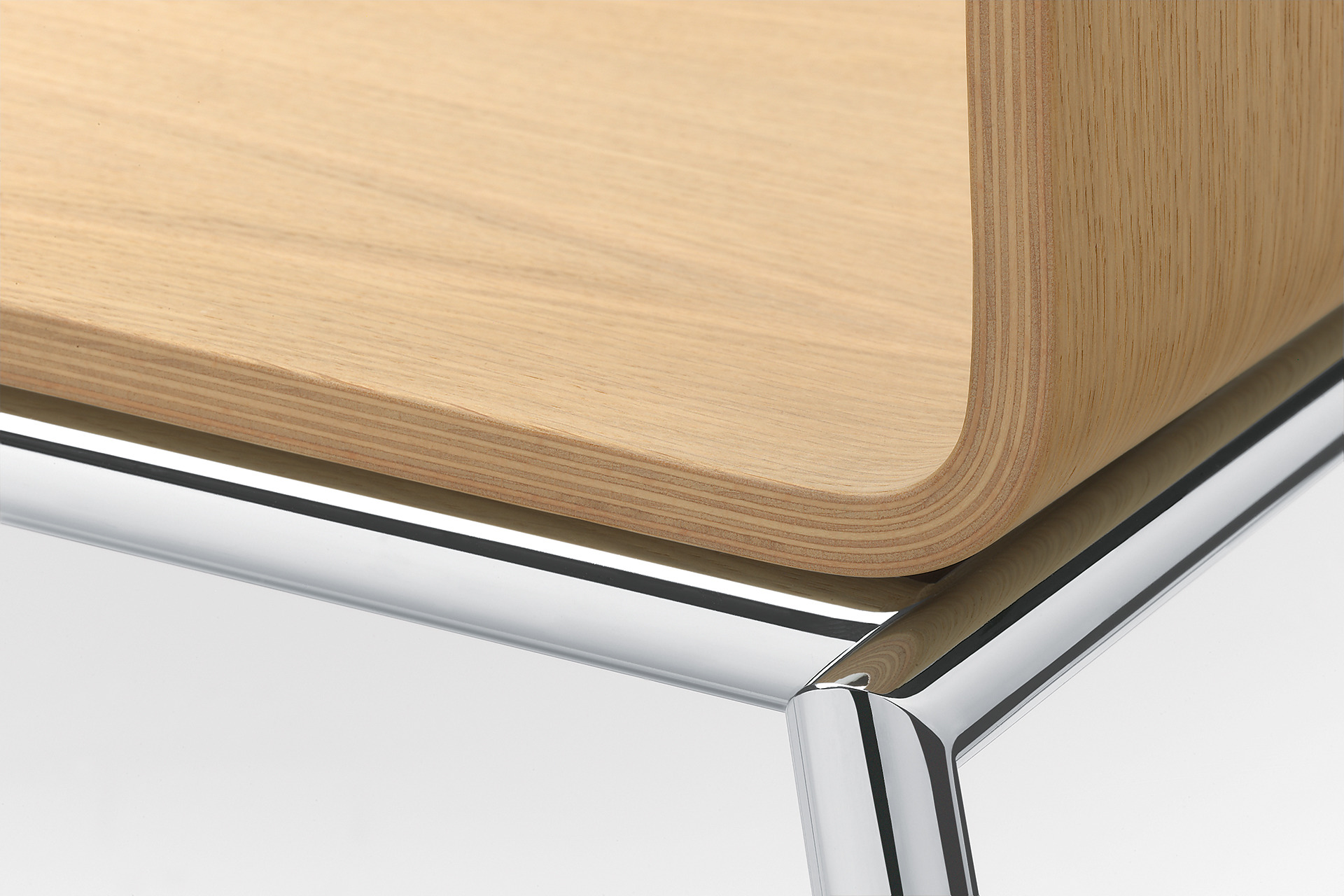 Its typical design features: the unusually small radius of the seat shell and its straight lines. Its design blends into any functional architecture and its wooden surfaces add ambience and warmth to a room. Patented: a specially developed, innovative technology is used to mould the wood veneers to such an extreme degree.