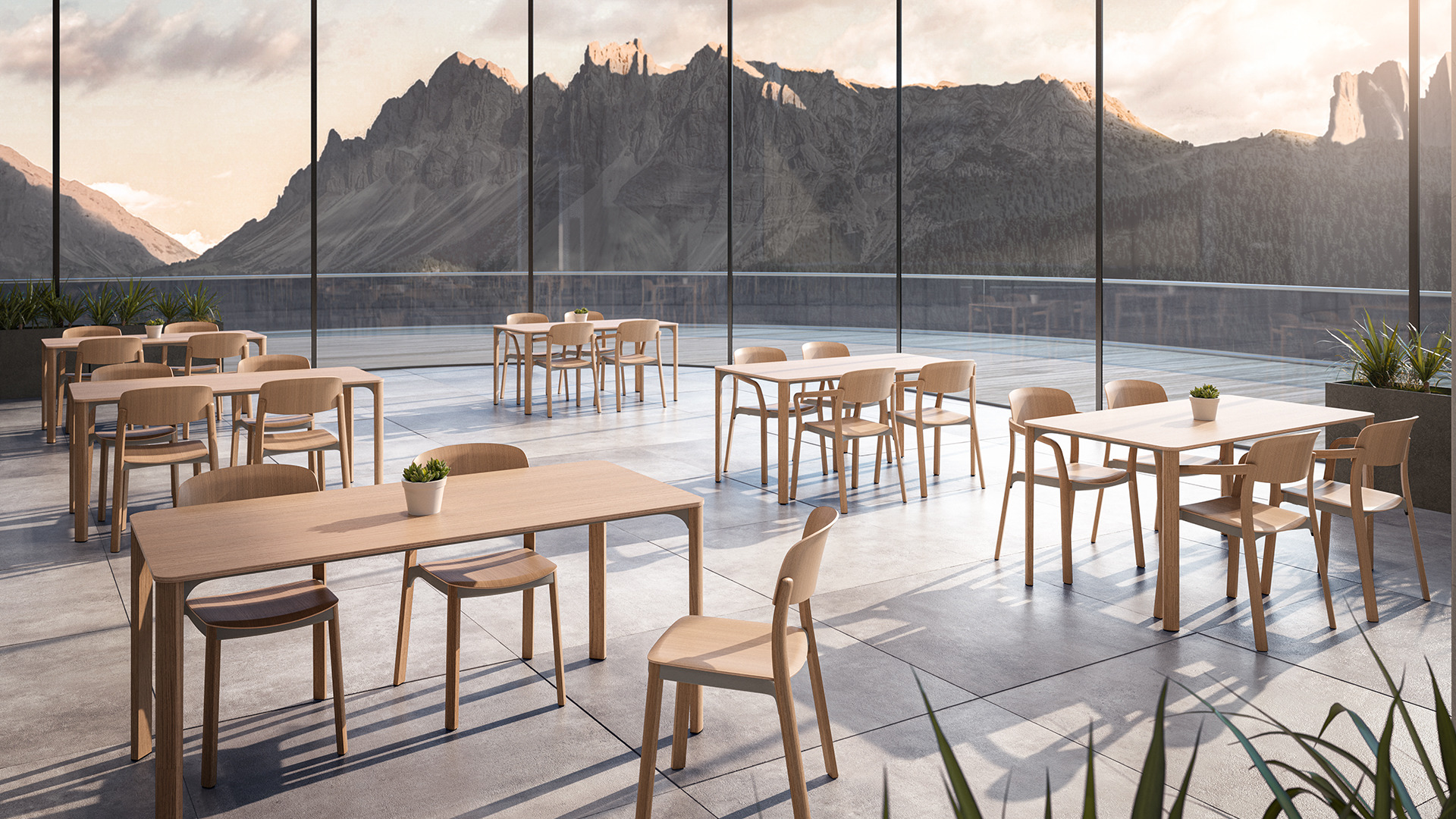 For nate, it all started with a light, stackable, hygienic and fully recyclable wooden chair 2.0. There was a great deal more potential to uncover in its pioneering combination of materials consisting of ultra-thin shaped wood, sturdy solid wood and a frame made from 100% recycled plastic. Stools, benches and tables then followed. A comprehensive range of products was born.