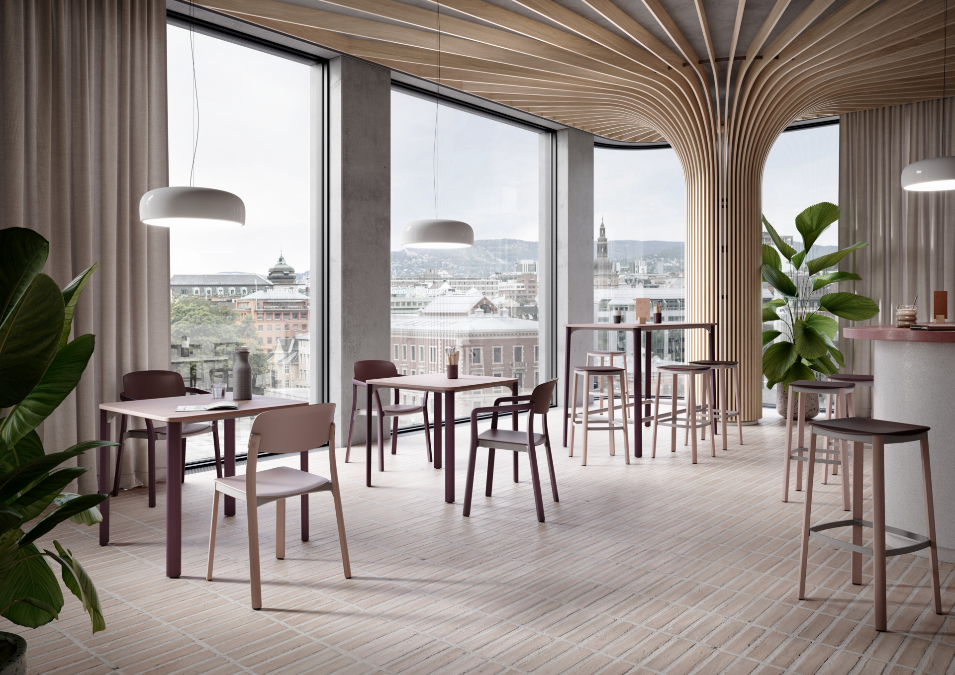 nate, Nate, Brunner, Brunner furniture, Atelier Steffen Kehrle, table, tables, wooden table, waiting area, cafeteria, restaurant, wooden furniture, sustainability, plywood technology, recycled plastic, sustainable resources, nature, technology