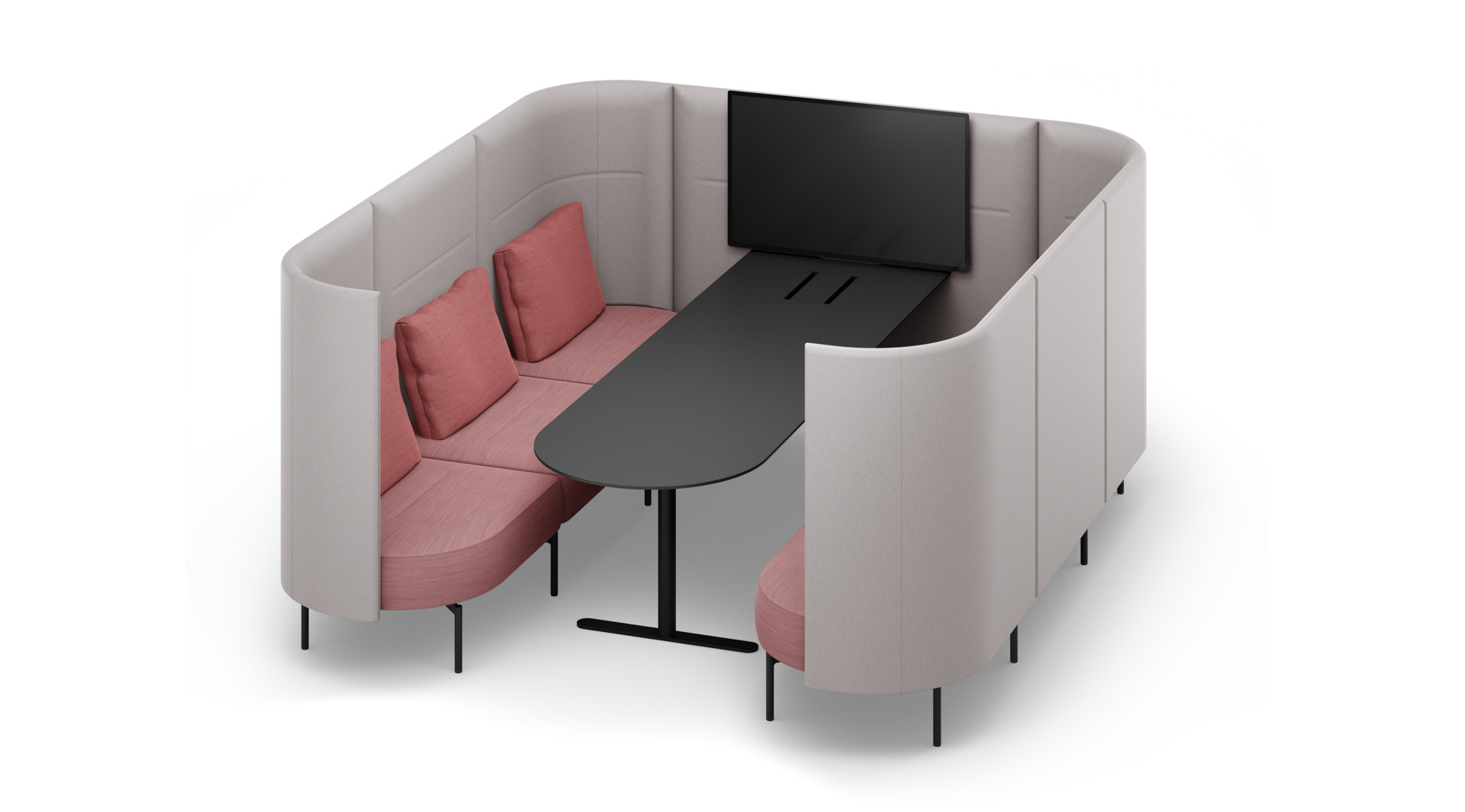 Et sur vous-même. Bienvenue dans la cabine de travail du système lounge polyvalent oval pour les entreprises et le domaine de la formation. De hauts panneaux avec une forme en U légèrement arrondie, au choix avec intégration multimédia, enveloppent la structure haut de gamme entièrement garnie, pour laquelle d’autres variantes d’électrification sont également disponibles. Des coussins souples invitent un maximum de six personnes au confort et aux réunions spécialisées. Et le résultat est convaincant. Que votre lieu de retraite soit en teinte unie ou coloré, qu’il soit orné de coutures de décoration, de piètement en bois convivial ou en tube acier filigrane, le choix vous appartient. oval vous offre tous les possibilités.