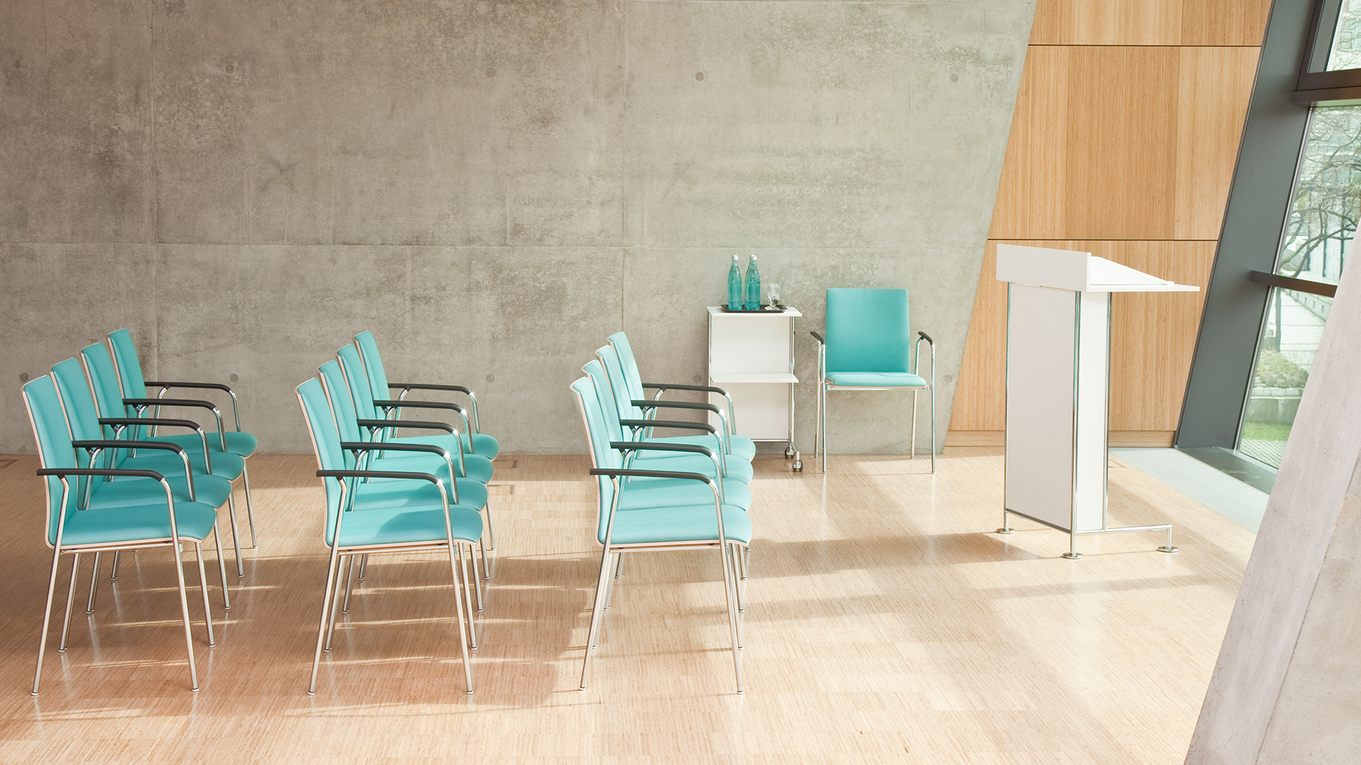 Les accessoires de torino font leurs preuves pratiques dans l’évènementiel ou dans le cadre de séminaires : Écran, vidéo projecteur et imprimante prennent discrètement place sur le serveur. Le pupitre d’orateur est équipé d’une tablette amovible. Et la desserte torino permet de stocker, bien rangés, boissons, snacks et matériels de travail.
