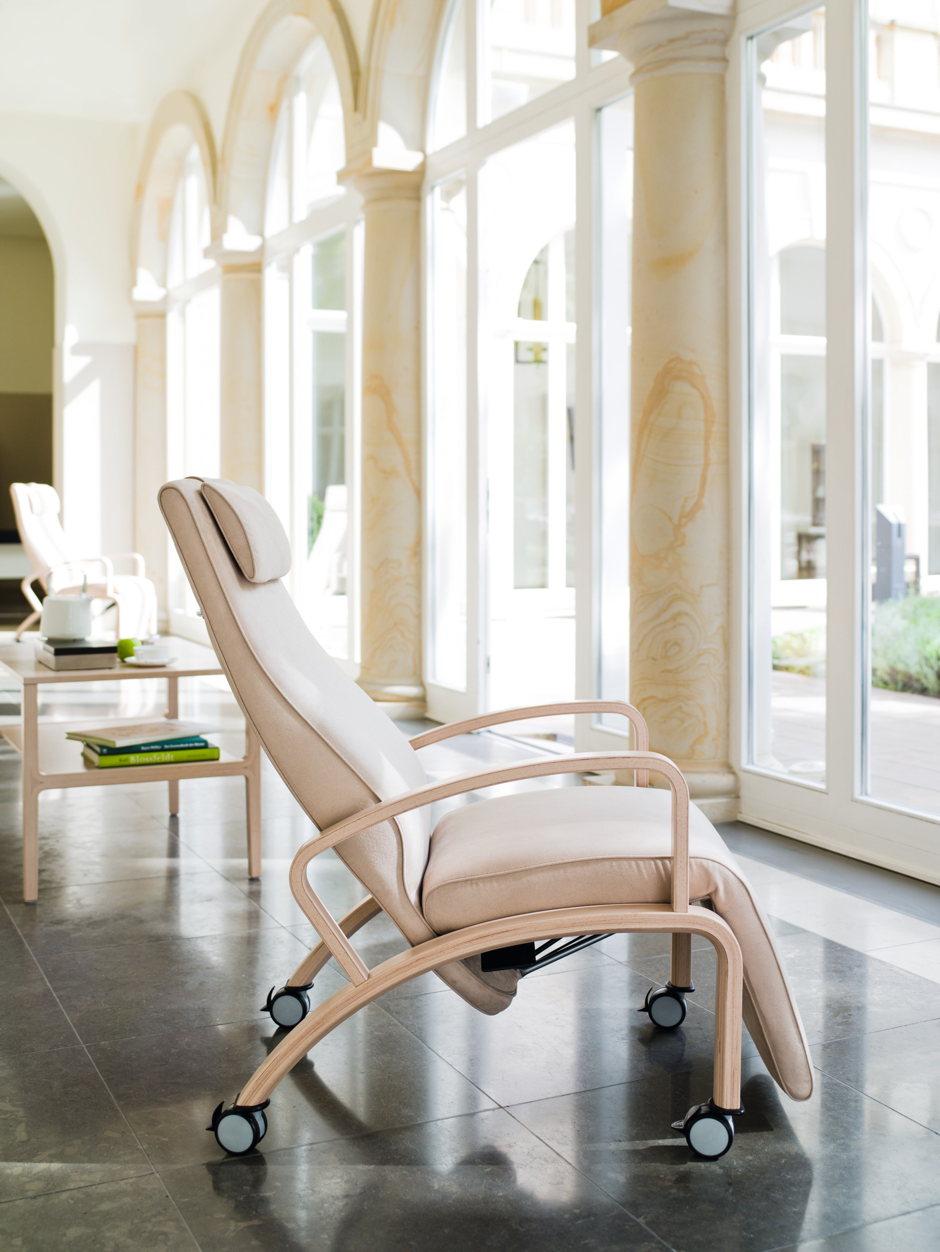 piétement en hêtre lamellé collé / fauteuil réglable / accoudoirs ouverts