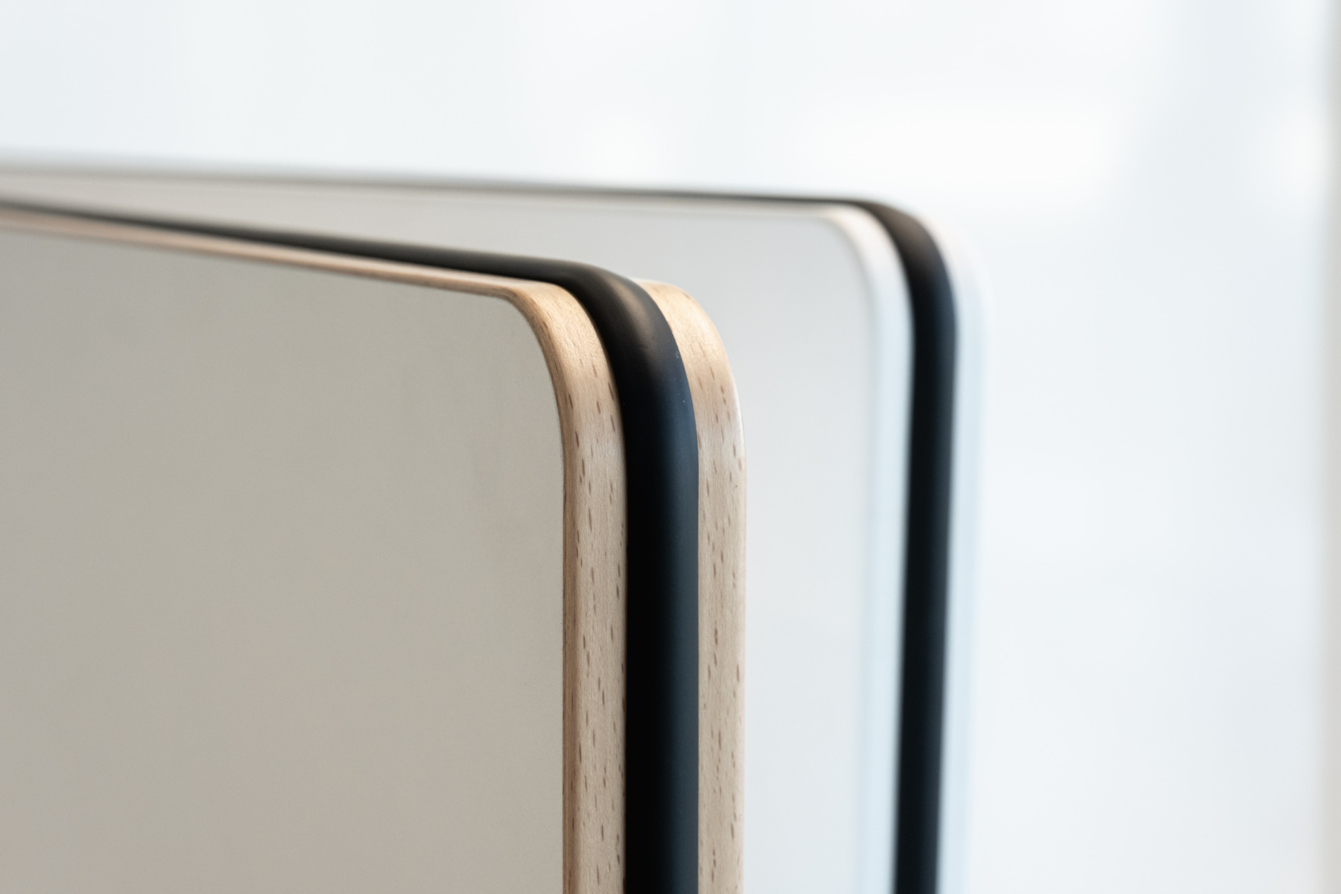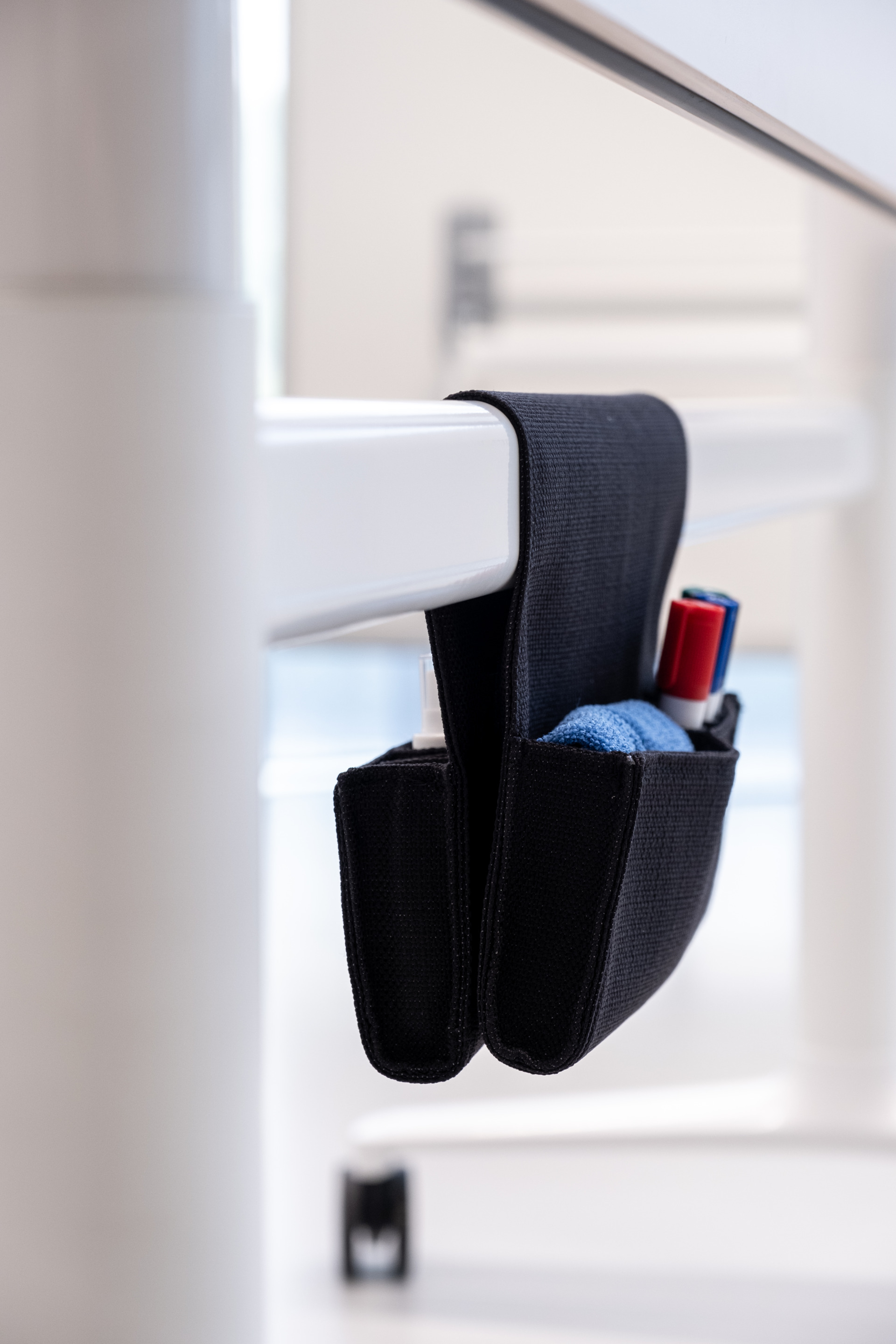 Whiteboardbeschichtung. Eine ergänzende Utensilientasche über der Quertraverse hält Stifte und Schwamm in Reichweite. Beste Aussichten fürs agile Office.