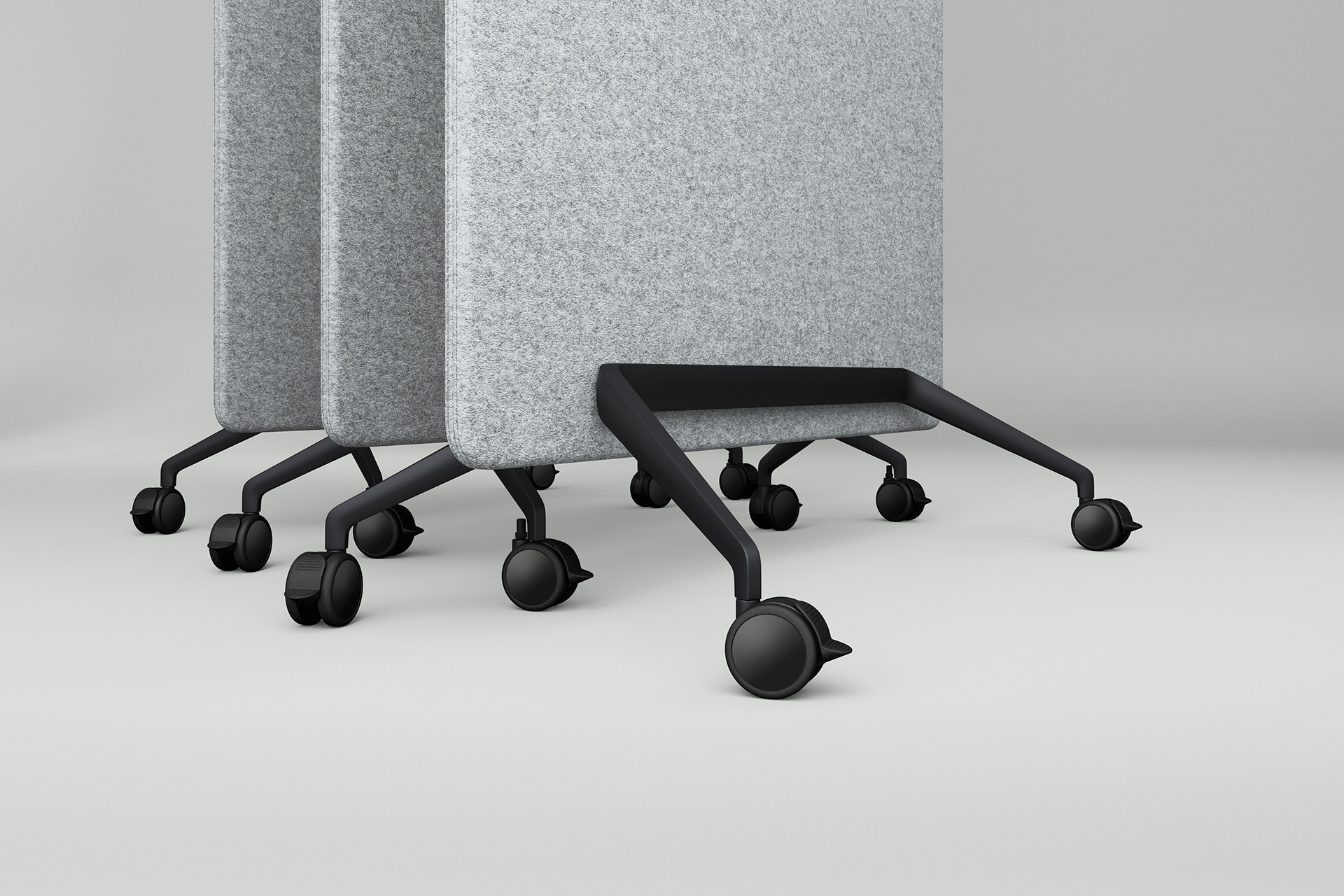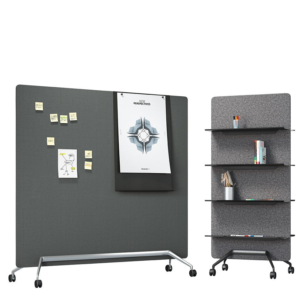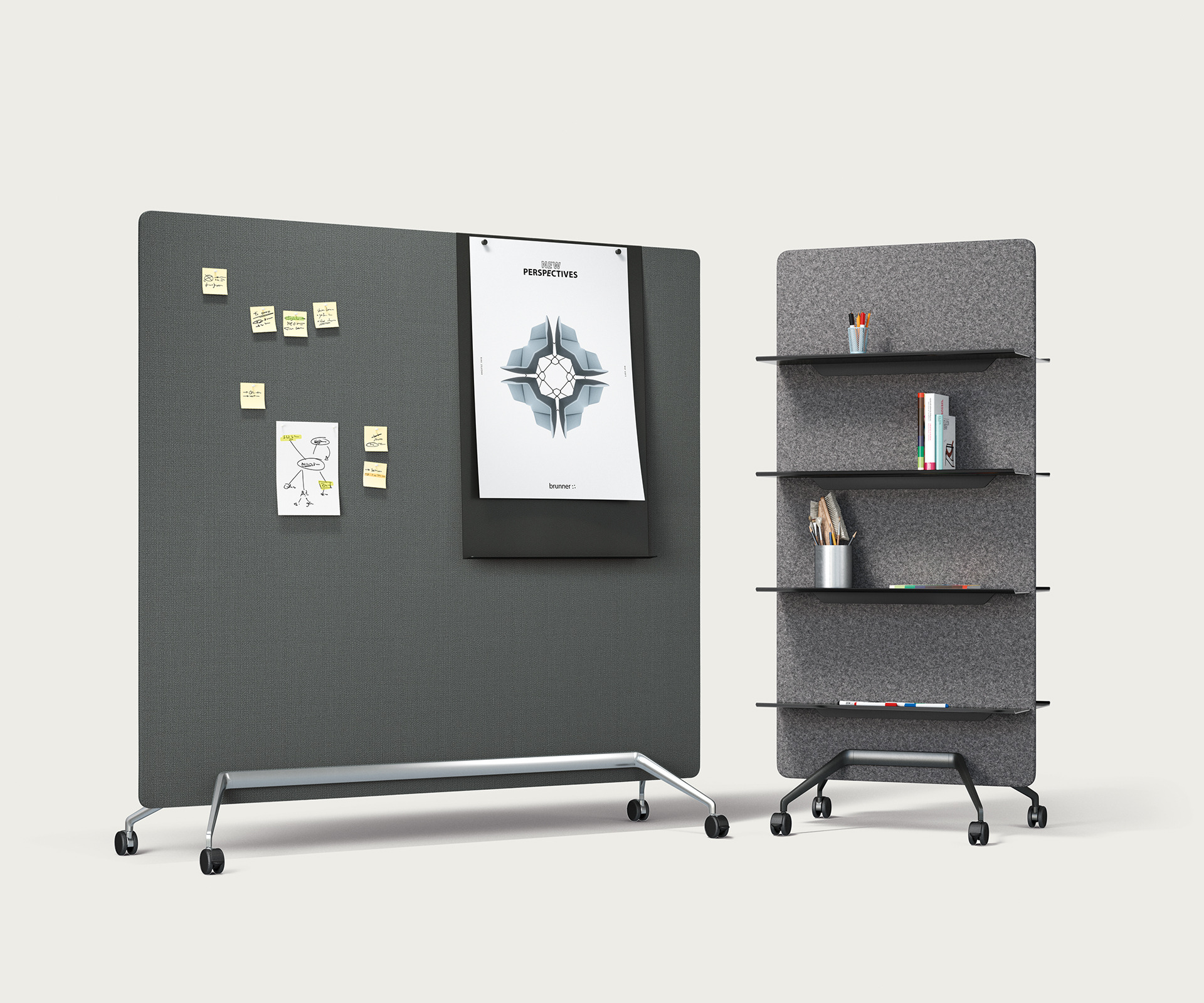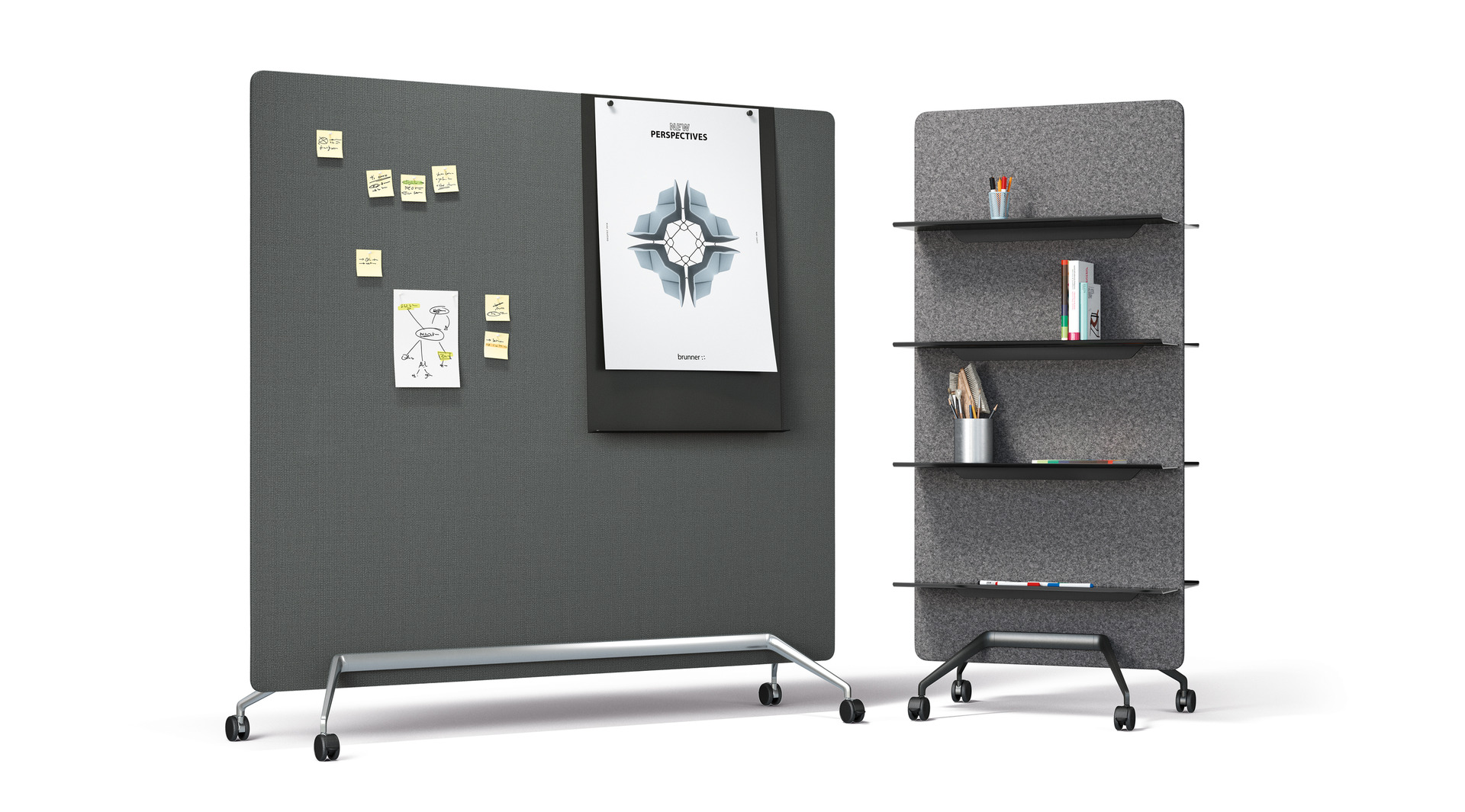 team, Brunner, Brunner Möbel, jehs+laub, Beistellmöbel, mobil, Trennwandsystem, Präsentationsboard, textile Trennwand, Pinnwand, Monitor, Flipchart, Raumteiler, Sichtschutz, platzsparend, staffelbar