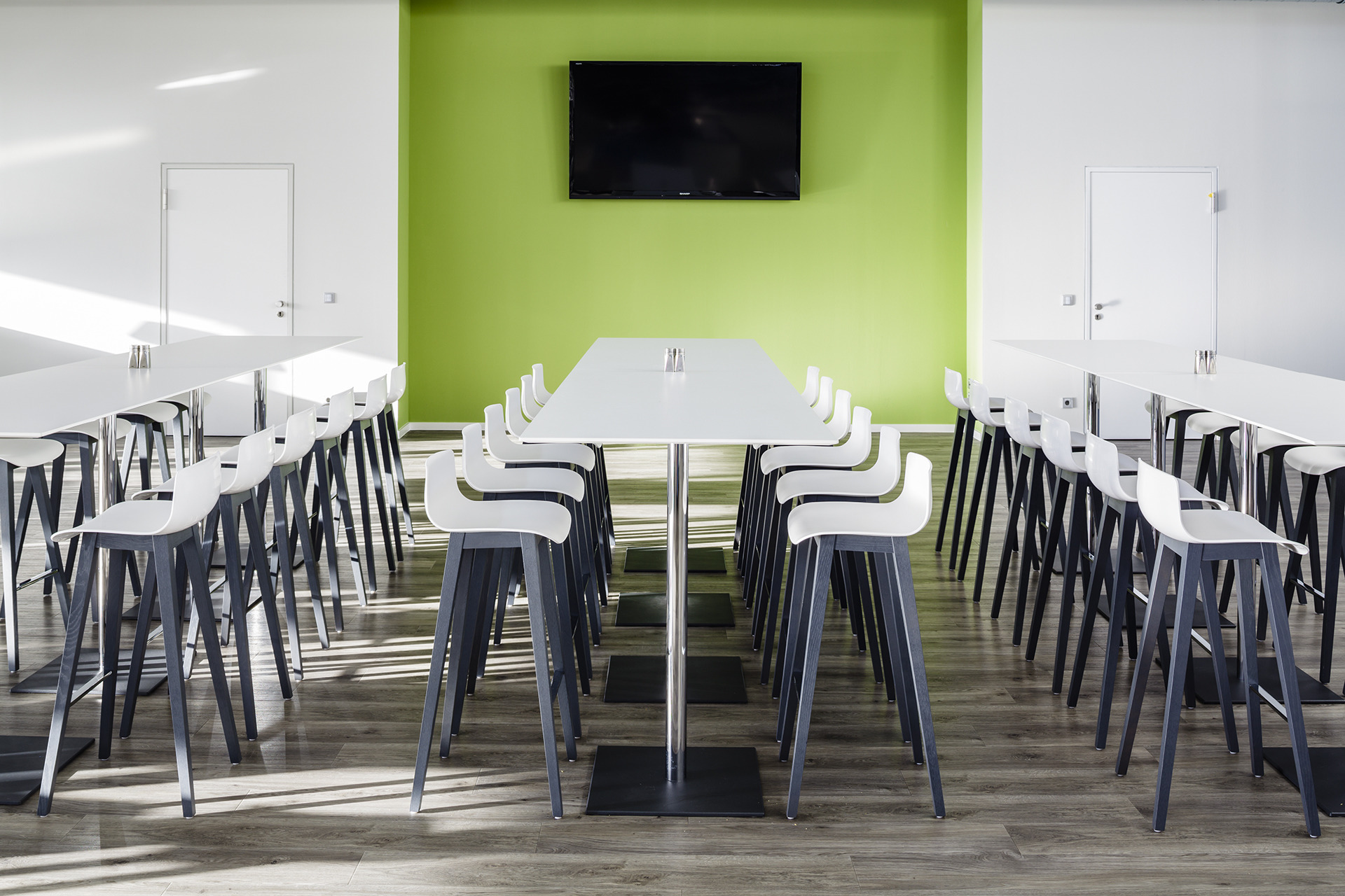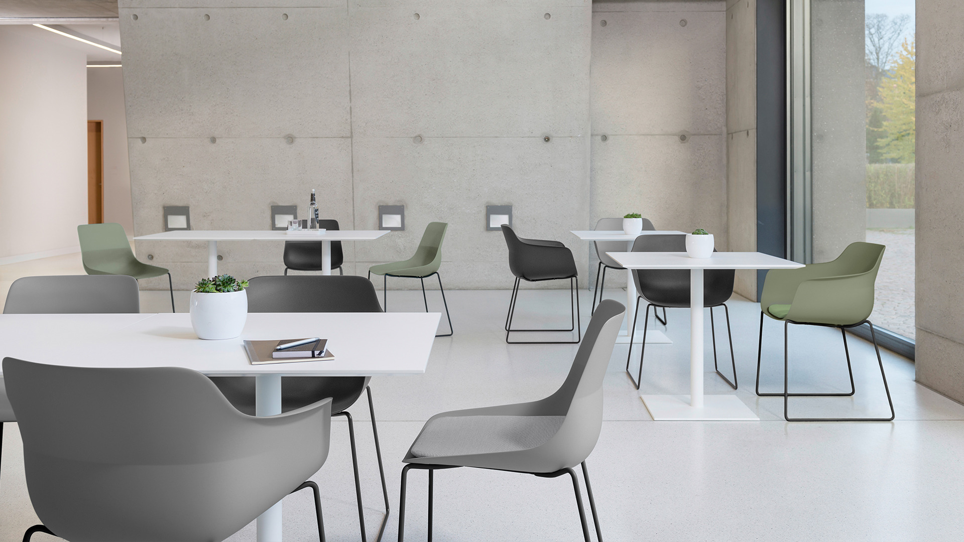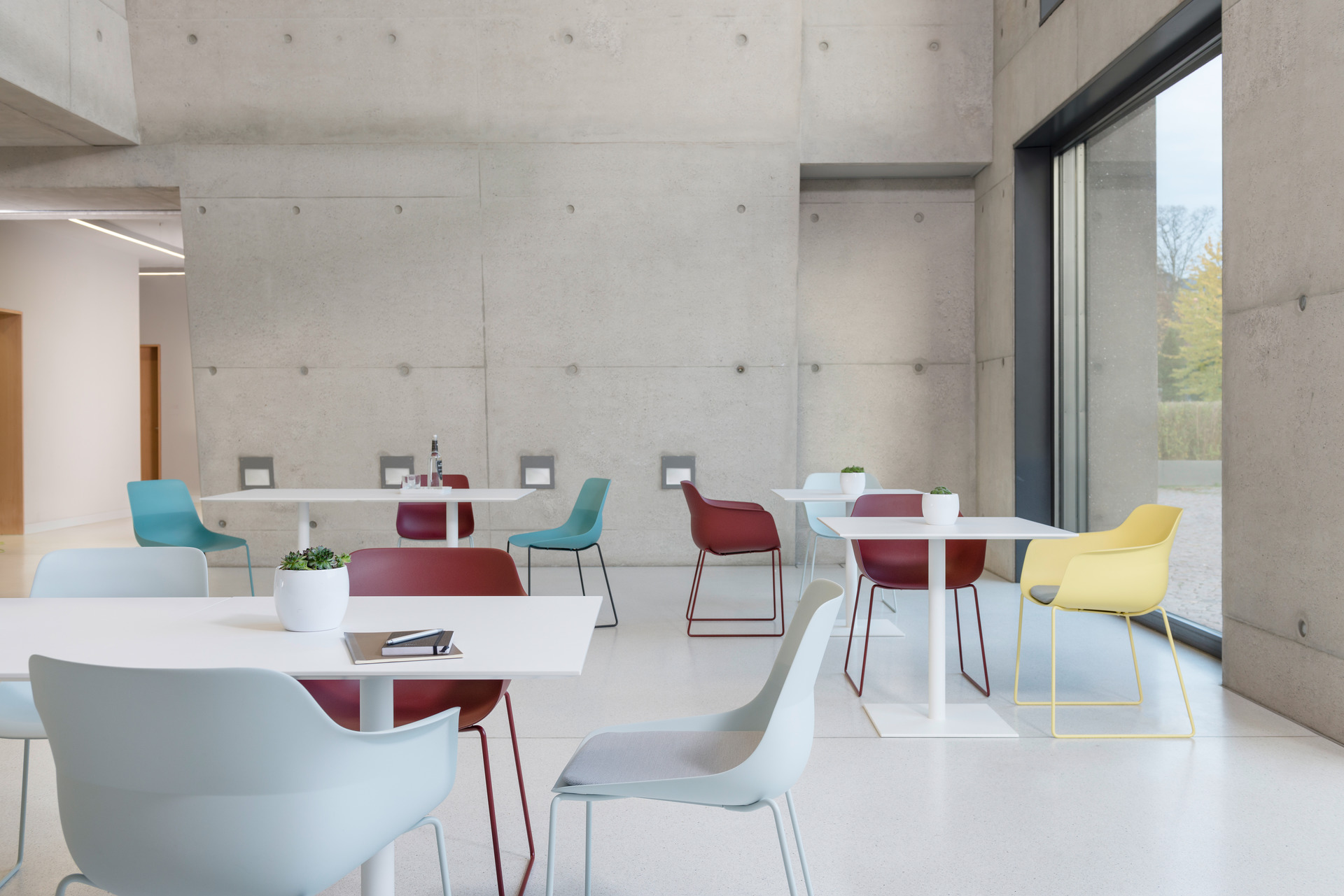 Überall da, wo in einem Unternehmen der Bereich Office aufhört und es langsam in Richtung Cafeteria geht, findet sich der Lebensraum unserer neuen Familie we. Tische, Barhocker und Bänke für konstruktive Gespräche.
